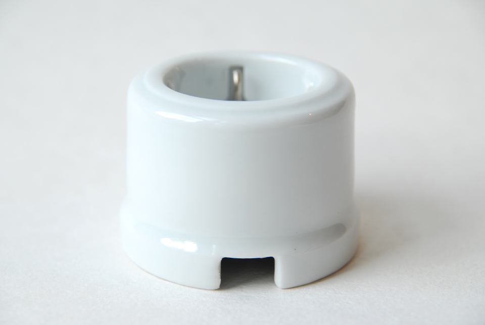 Posliininen pinta-asennettava ykköskytkin retrotyylisellä vääntönupilla. Kaapeliläpivienti sivulla.M..